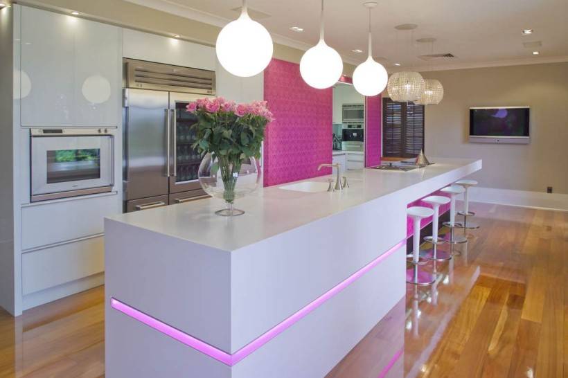 Чтобы интерьер кухни выглядел стильно, а не вульгарно, очень важно придерживаться правильного баланса, создавая разные цветовые композиции в тандеме с розовым