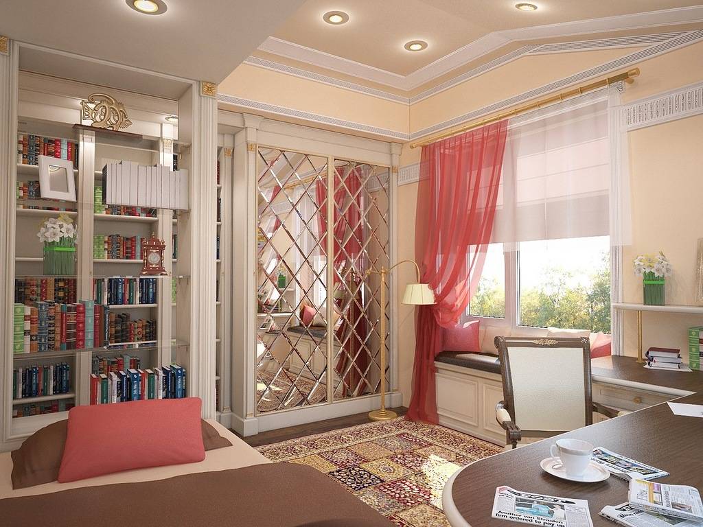 - Расширение пространства. Благодаря зеркальной поверхности можно изменить геометрию помещения, придав ему дополнительный объем.