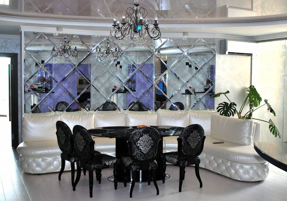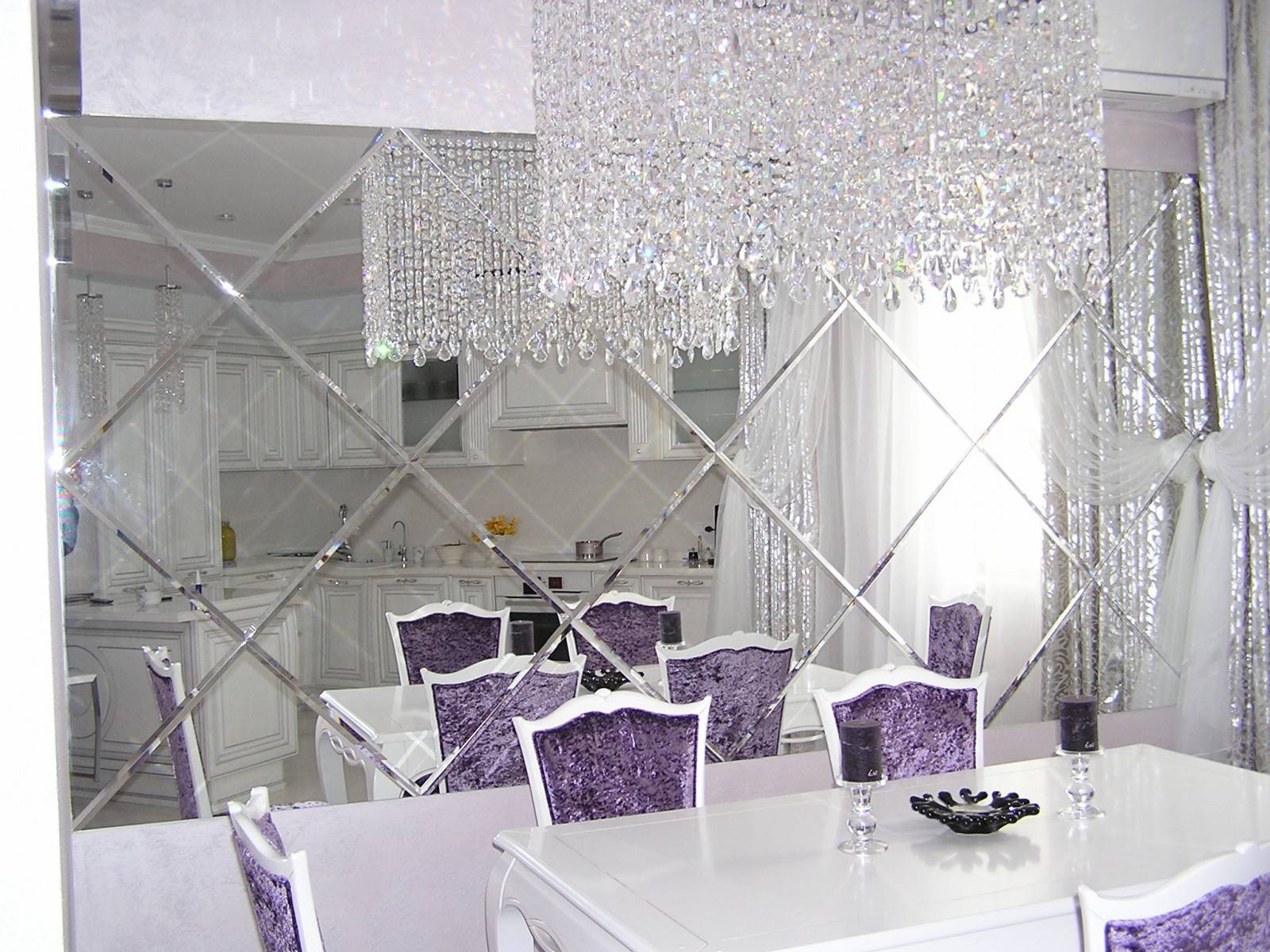 Зеркальные панно роскошно смотрятся в интерьере кухни, благодаря сверкающим бликам они создают здесь праздничную торжественную атмосферу. Такое изысканное оформление часто можно увидеть на фото помещений, выполненных в стиле барокко или ампир. Не менее эффектно плитка с фацетом будет смотреться в современных интерьерах, так как она прекрасно сочетается с предметами мебели, имеющими стеклянные или глянцевые поверхности.