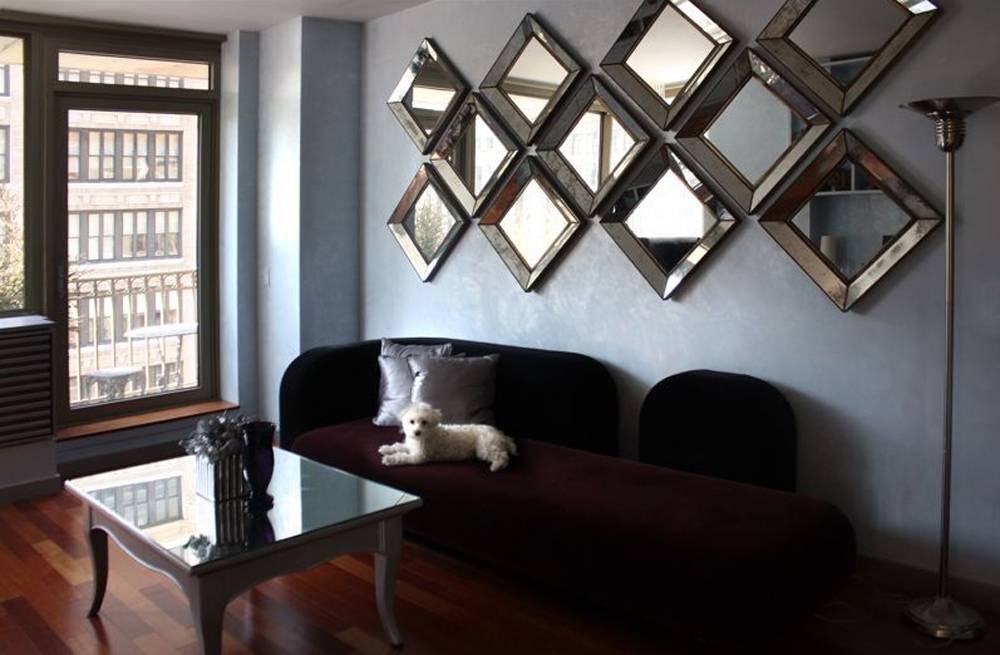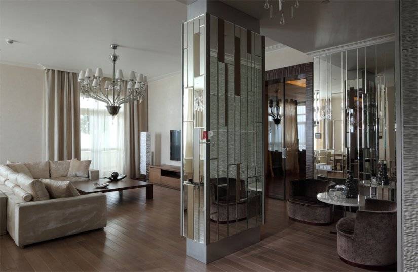 В этой гостиной использованы зеркальные панели с фацетом, что чаще всего можно заметить в интерьерах в стиле ар-деко