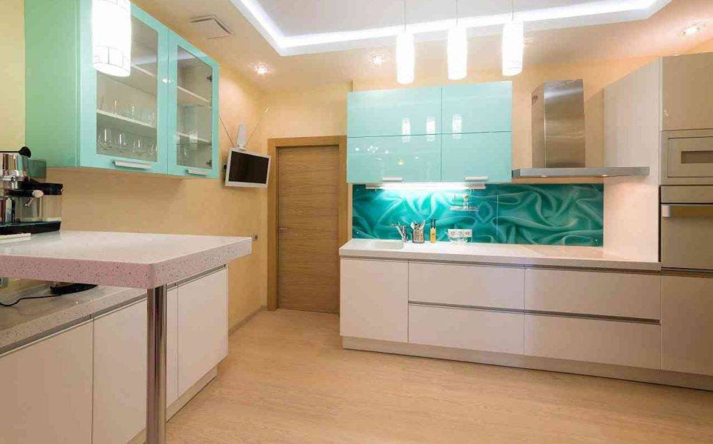 Кухонный гарнитур бирюзового цвета с бежевым в тандеме