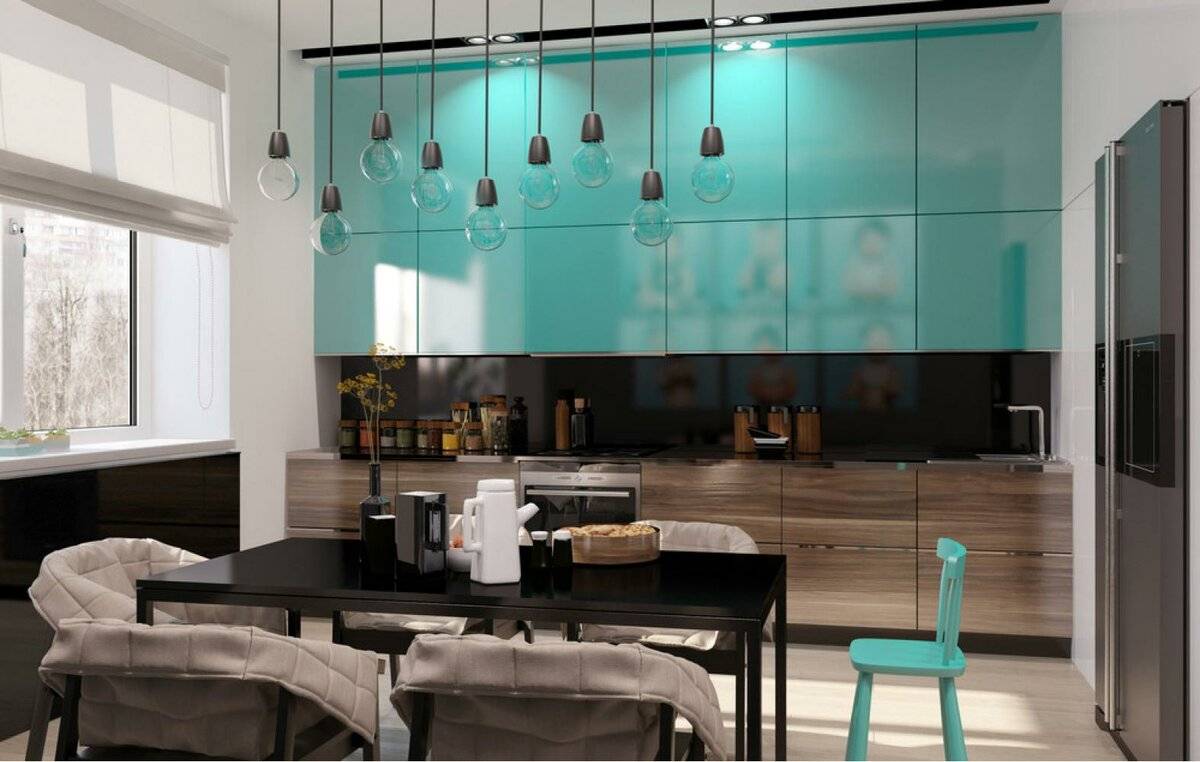 Кухня бирюза будет хорошо смотреться и в глянцевом, и в матовом виде.