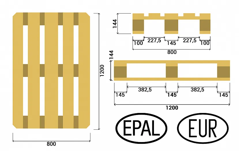В международных перевозках используется стандартная тара. Её размеры составляют 800х1200 мм. Ширина верхних широких плашек 145 мм, узкий 100 мм. Для изготовления одного элемента используются восемь реек одинаковой длины. Высота одной паллеты составляет 144 м.
