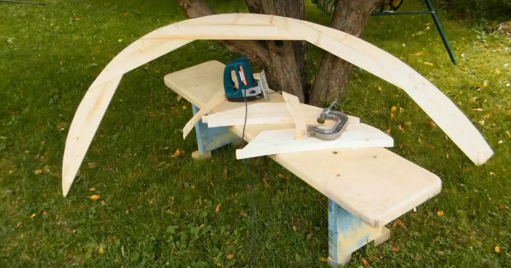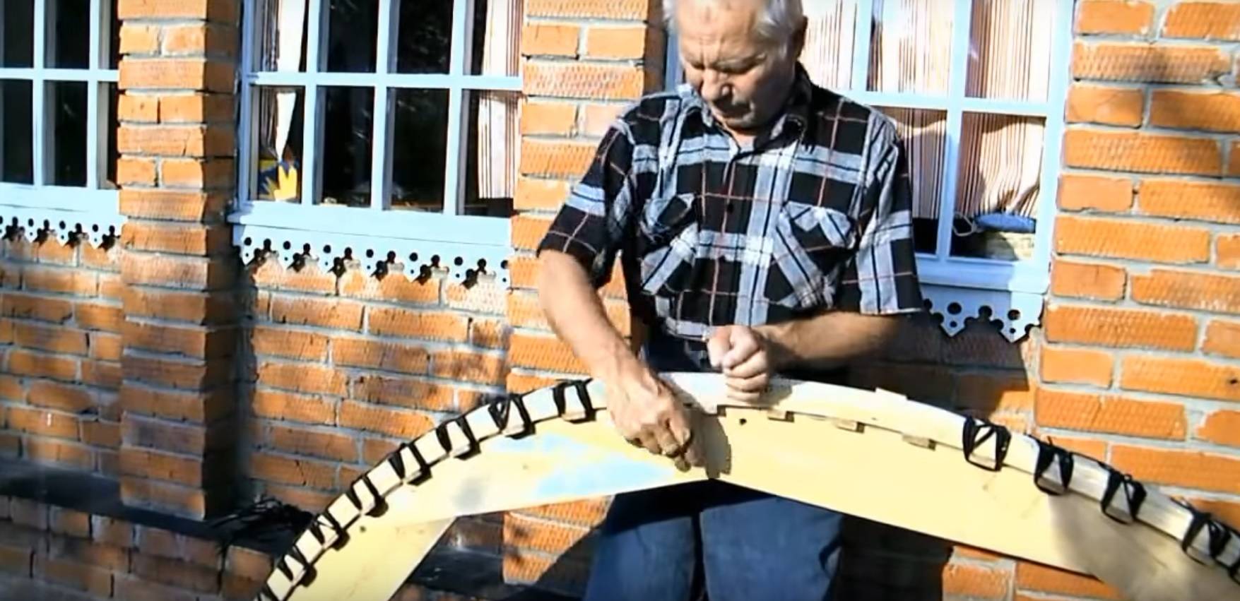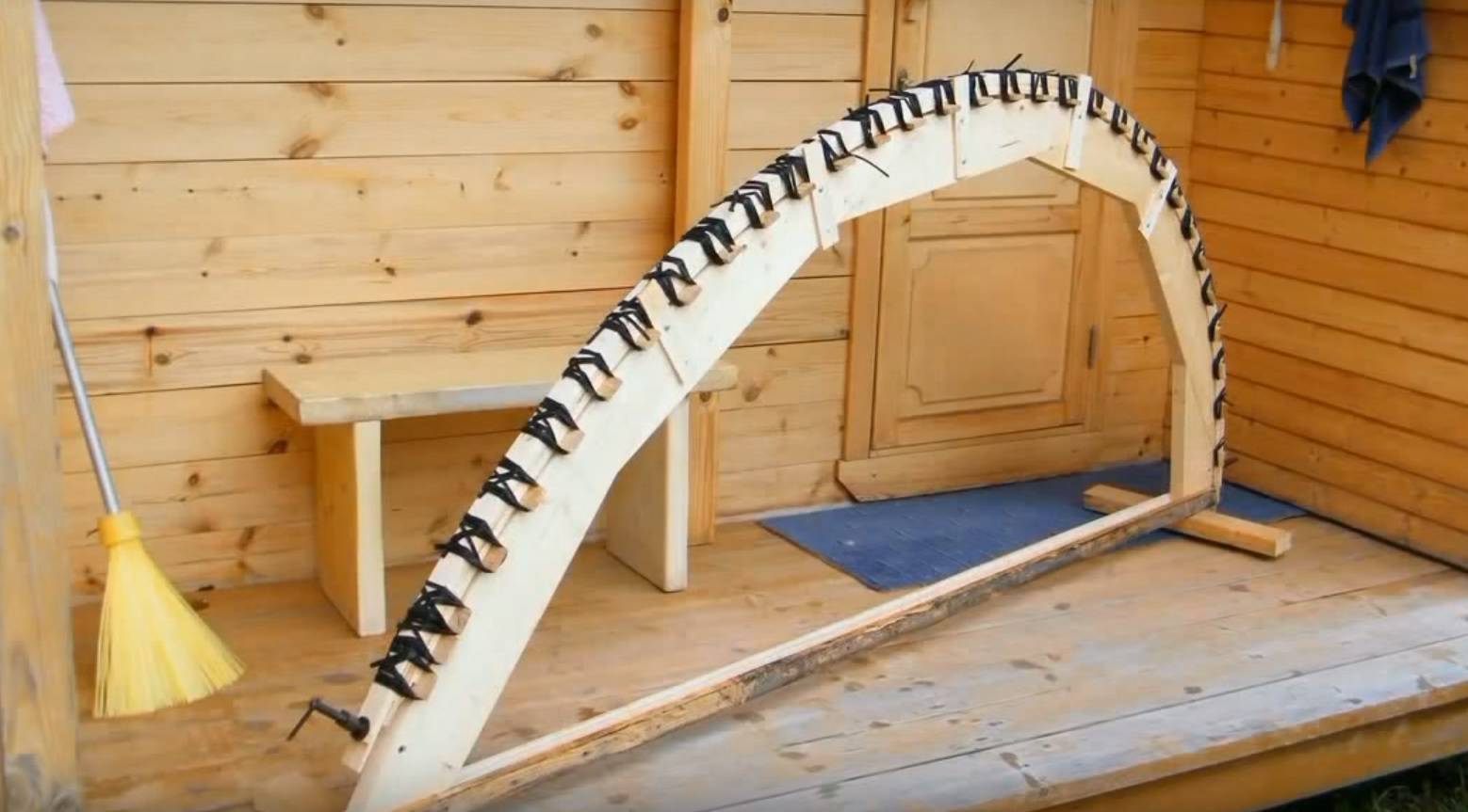 Затем по чертежу необходимо изготовить шаблон для сборки гнутоклееных дуг из деревянных досок.