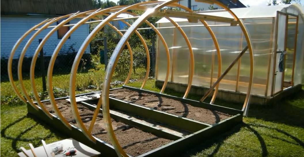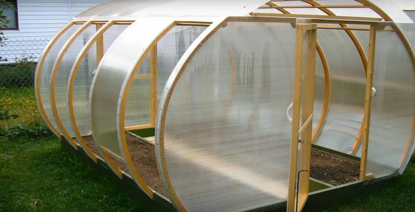 А теперь ознакомимся с инструкцией создания оригинальной и красивой теплицы из дерева и поликарбоната. Она имеет очень интересную форму и чем-то похожа на туннель. Мы ее будем не только скручивать/сколачивать, но даже клеить.
