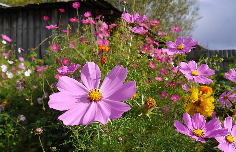 Космея с ее ажурной листвой неприхотлива, быстро растет. Цветы встречаются как ажурные, так и простые.