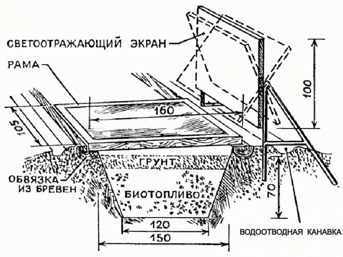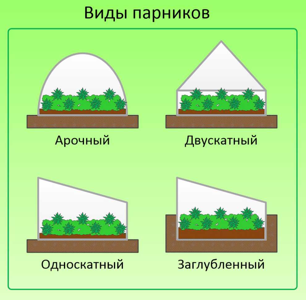 Углубленный выглядит как траншея с верхней обвязкой из досок, кирпича или другого материала, имеющегося в хозяйстве. За счет такого устройства для «особенной грядки» требуется меньше «подогревающего вещества». Углубленные парники делают как с односкатной, так и с двускатной крышей, а также арочной. При этом имеющие плоские односкатные называют русскими, а двускатные домиком именуются бельгийскими. И подходят они для высоких растений.