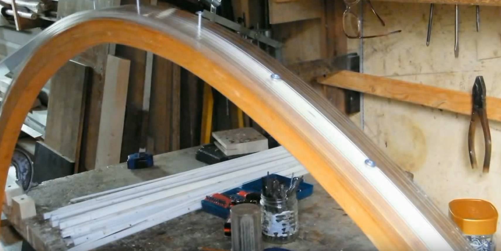 После высыхания дуг на их нижних частях закрепляются саморезами накладки из двух лент поликарбоната и деревянной ленты-проставки между ними.