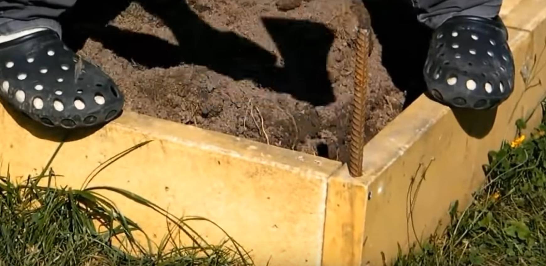 На следующем этапе собирается простой фундамент-обвязка из бруса, соединенного металлическими уголками. Фундамент крепится к грунту при помощи арматуры.