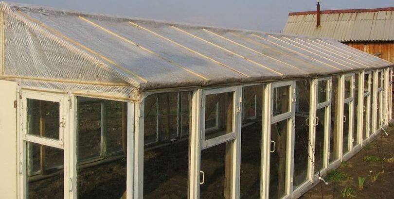 Красивый парник с крышей из старых оконных рам, покрытый полиэтиленовой пленкой