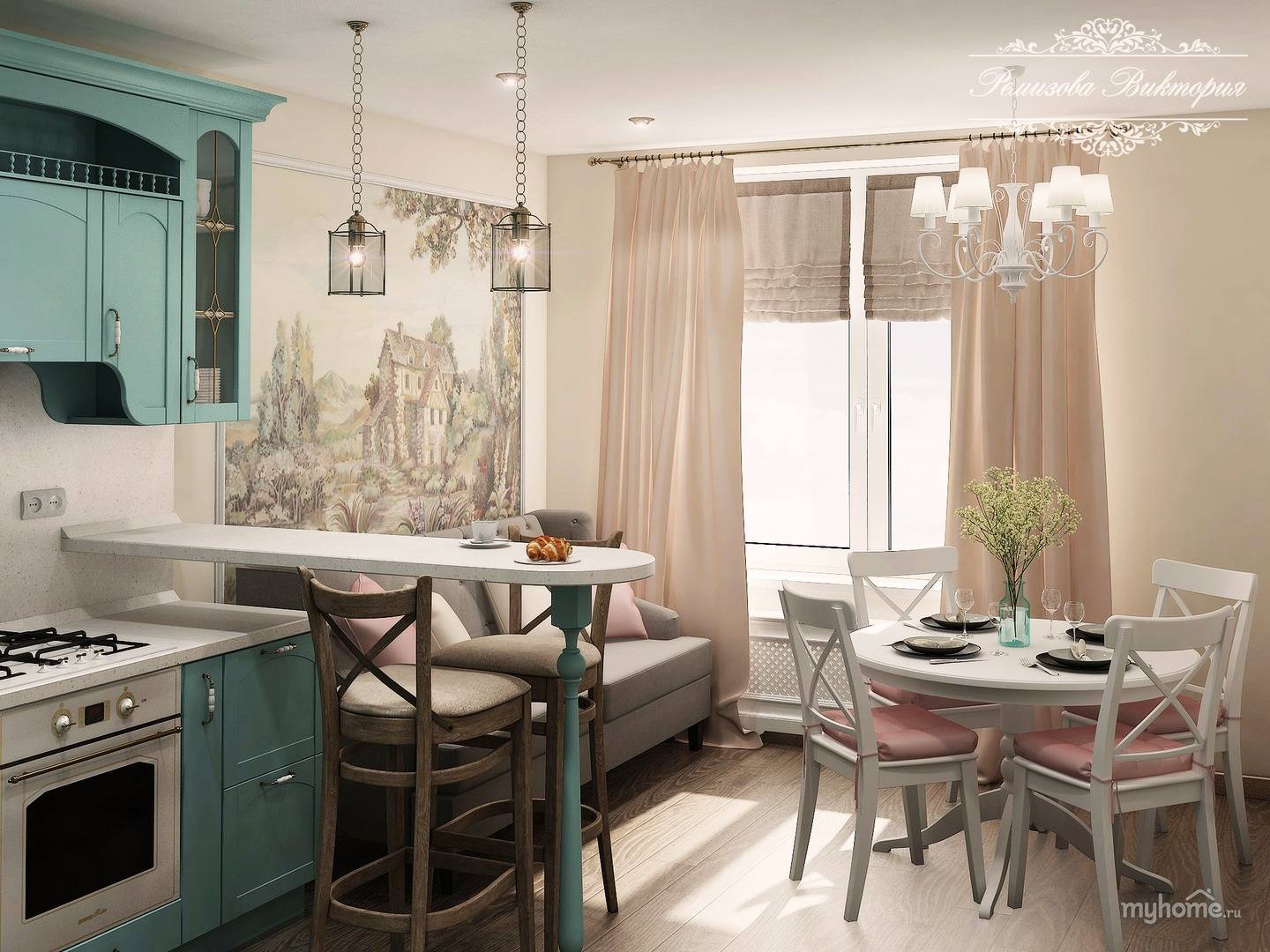 - Прованс. Стиль потребует особого подхода к выбору мебели, декорирующих тканей и цвета. Здесь используются только натуральные, пастельные тона: цвет неба, облаков, луговых цветов и трав. Мебель обязательно светлых оттенков, искусственно состаренная. - Общий облик помещения должен получится нежным, воздушным и солнечным. Окна оформляются легкими занавесками, хорошо пропускающими свет. Текстиль допускается как однотонный, так и с орнаментом. Причем на занавесках, диванных подушках, кухонных прихватках должны быть сельские мотивы: неброские цветы, травы, мелкие ракушки. - В стиле прованс перегородкой для зон может служить диван, обеденный стол. Хорошо подойдут к данному стилю полы в зоне гостиной из необработанного потертого дерева, а для дизайна кухни – плитка подходящих тонов. Во всем должна чувствоваться простота и естественность. Фото интерьера кухни-гостиной, созданного на площади 18 кв. м в стиле прованс убедят вас в этом;