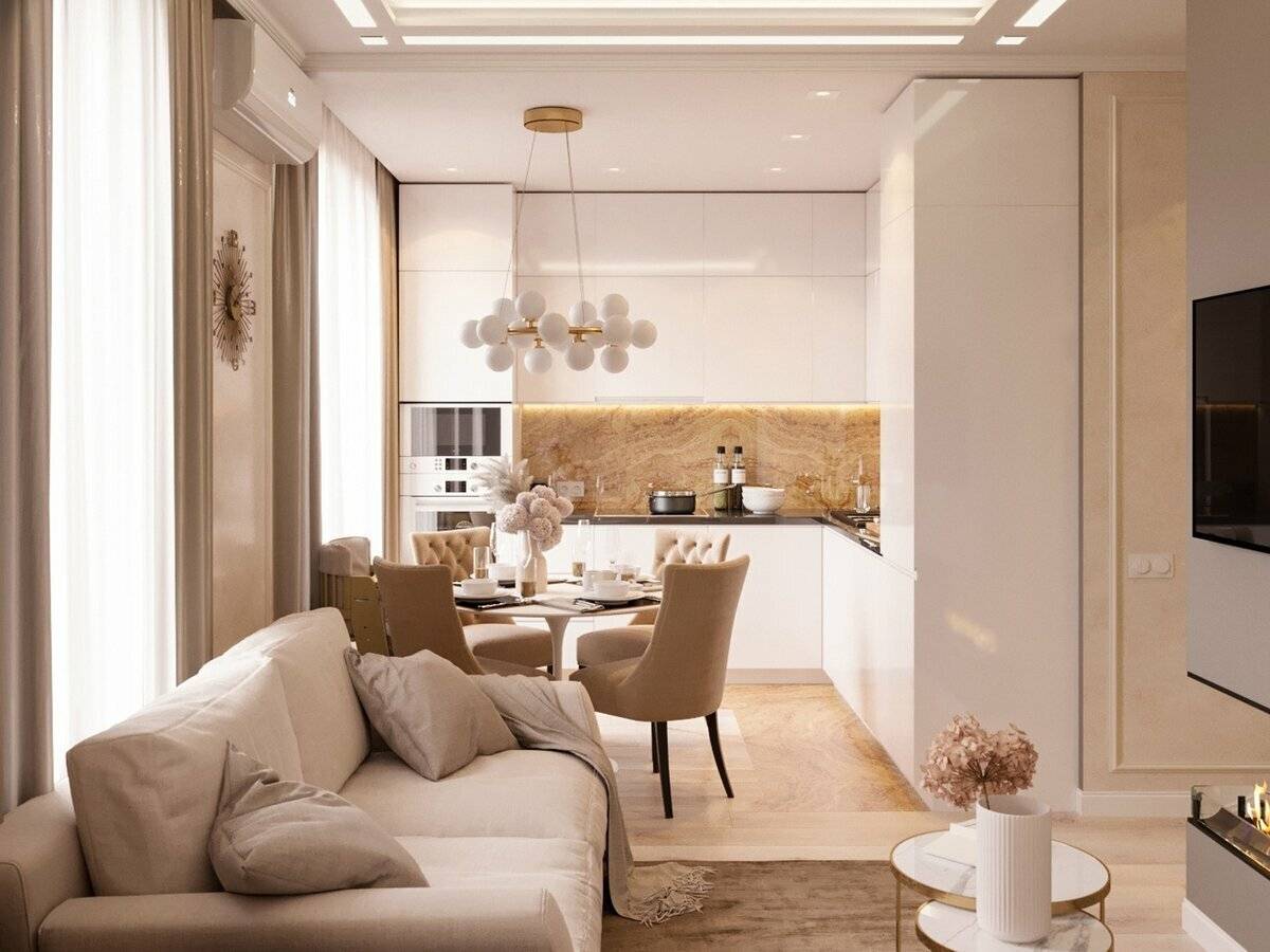 Классический стиль в интерьере гостиной, совмещённой с кухней