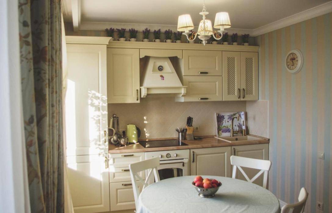 Чтобы не загромоздить маленькую кухню, лучше отказаться от лепнины, резьбы, вычурности.