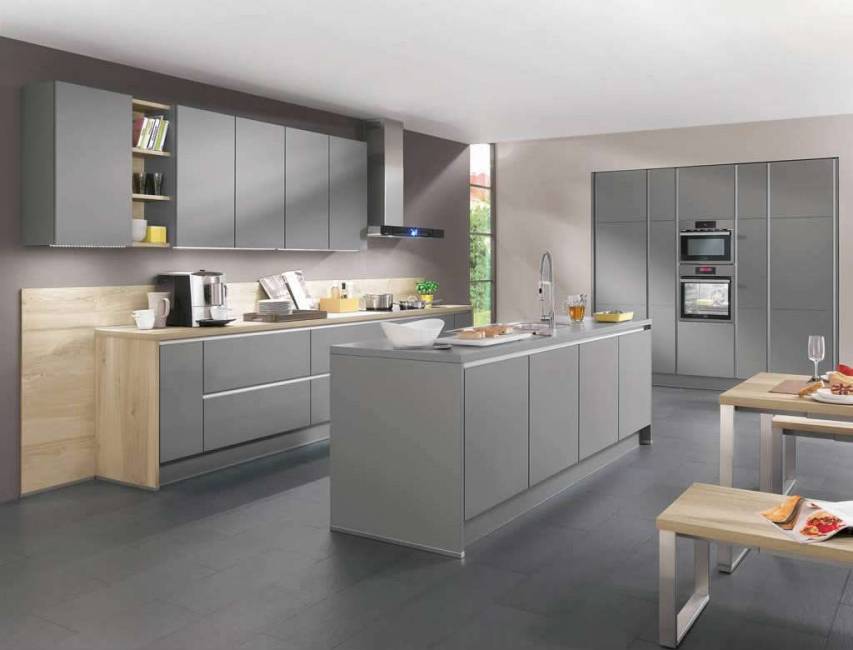 Серые поверхности одинаково хорошо выглядят как в матовом, так и в глянцевом варианте. Стильно и современно смотрятся кухни с обилием деревянных элементов. Выбор в пользу образа оформления осуществляется с учетом вкусовых предпочтений владельца и расположения объектов в пространстве