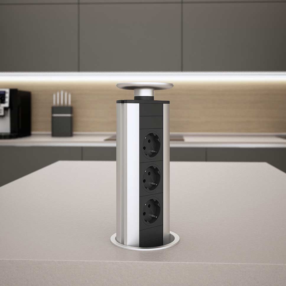 Последнее особенно актуально для кухонь с одноуровневым «островом», рядом с которым нет стен. Подобная конструкция розеток предназначена для подключения бытовой техники и в сложенном состоянии скрыта от глаз внутри столешницы.