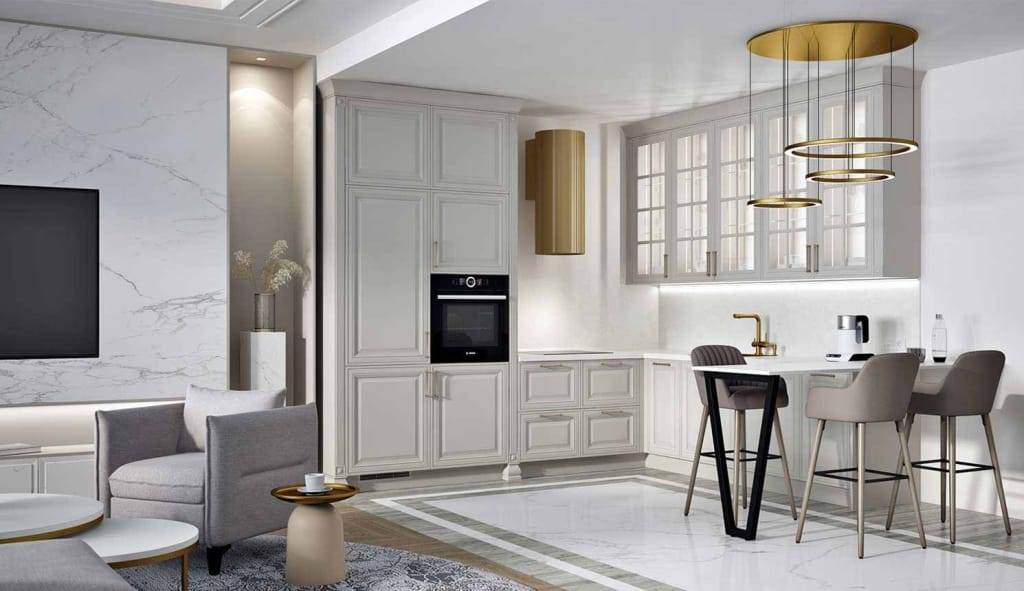 Это направление выбирают те, кому современные решения кажутся слишком простыми, а классика – вычурной и чопорной. Для кухни в стиле неоклассика подойдет бежевый или дымчатый ламинат, стены могут быть сливочными.