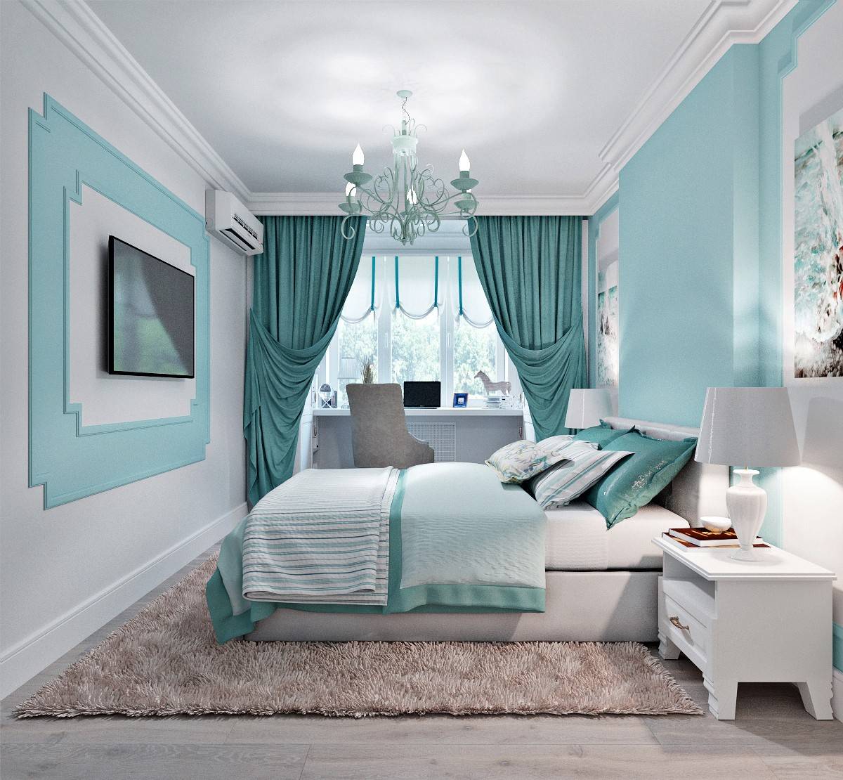 Для спальной комнаты лучше выбрать холодные оттенки бирюзы с серебром или припыленной бирюзы, они прекрасно успокаивают, дают ощущение свежести и даже обладают снотворным эффектом.