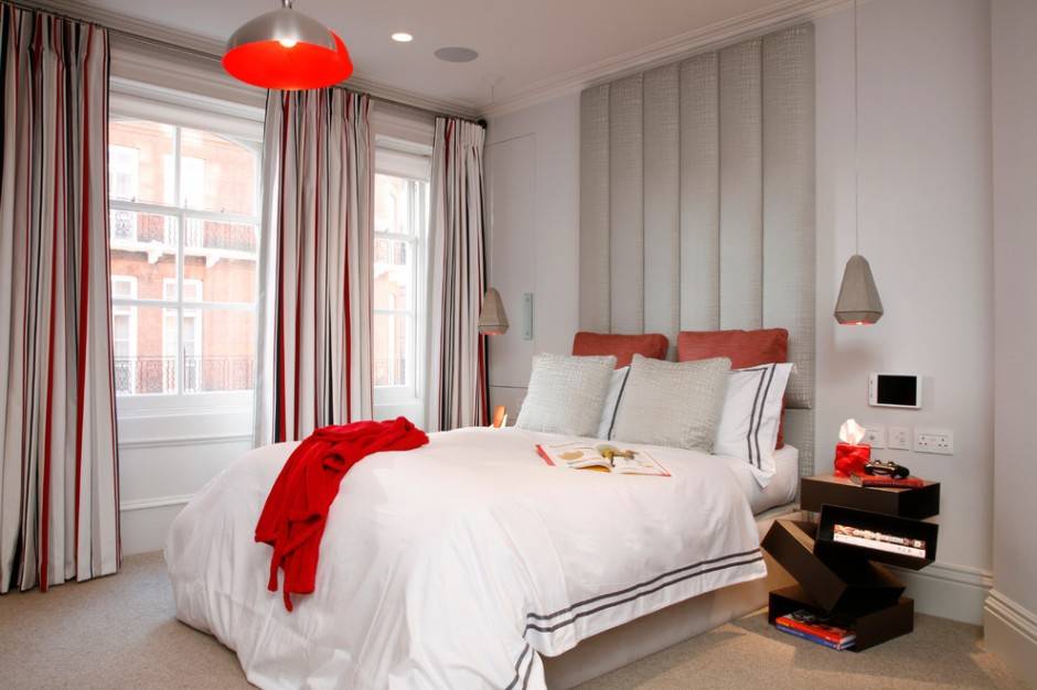 Яркие красные пятно в серой спальне