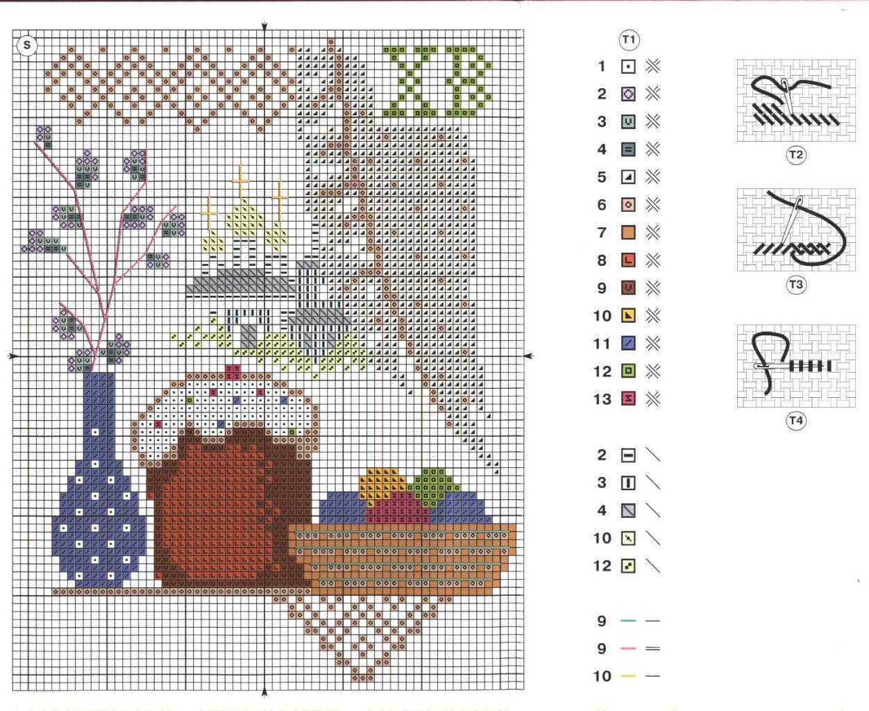 Вышивают нитью в четыре сложения. При этом один крестик вышивается на двух клетках ткани. На схеме имеются пунктирные линии, это контур, его нужно вышить светло-коричневой ниткой в два сложения строчным швом.