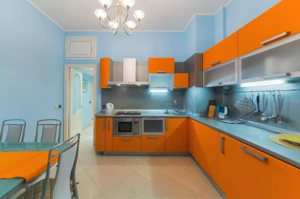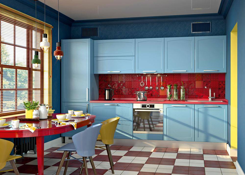 Успокаивает, оказывает положительное действие на психику. Можно не бояться использовать оба насыщенных тона вместе. Независимо от площади кухни можно поиграть на оттенках и поэкспериментировать.