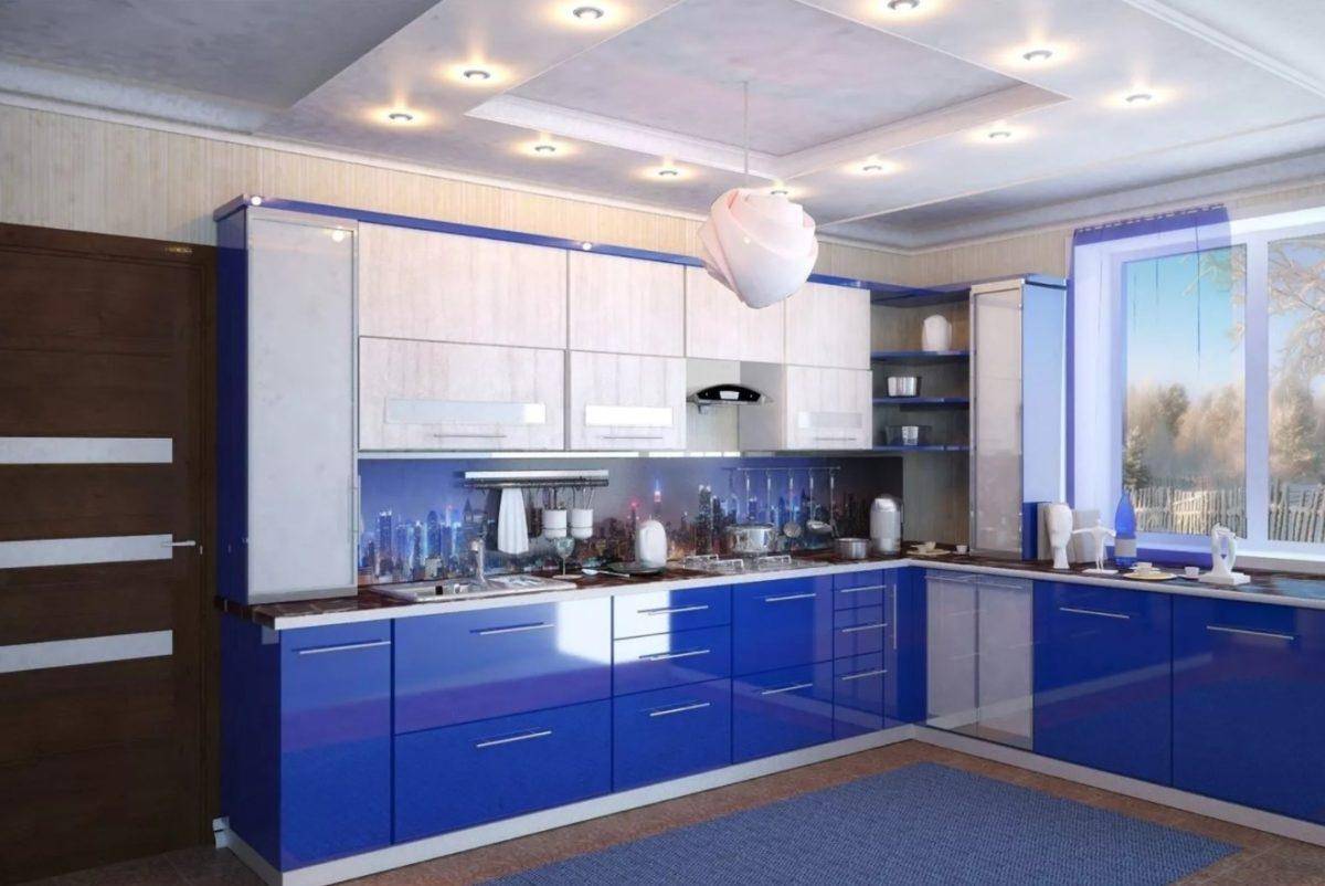 комбинирование синих и белых фасадов в интерьере белой кухни интерьере