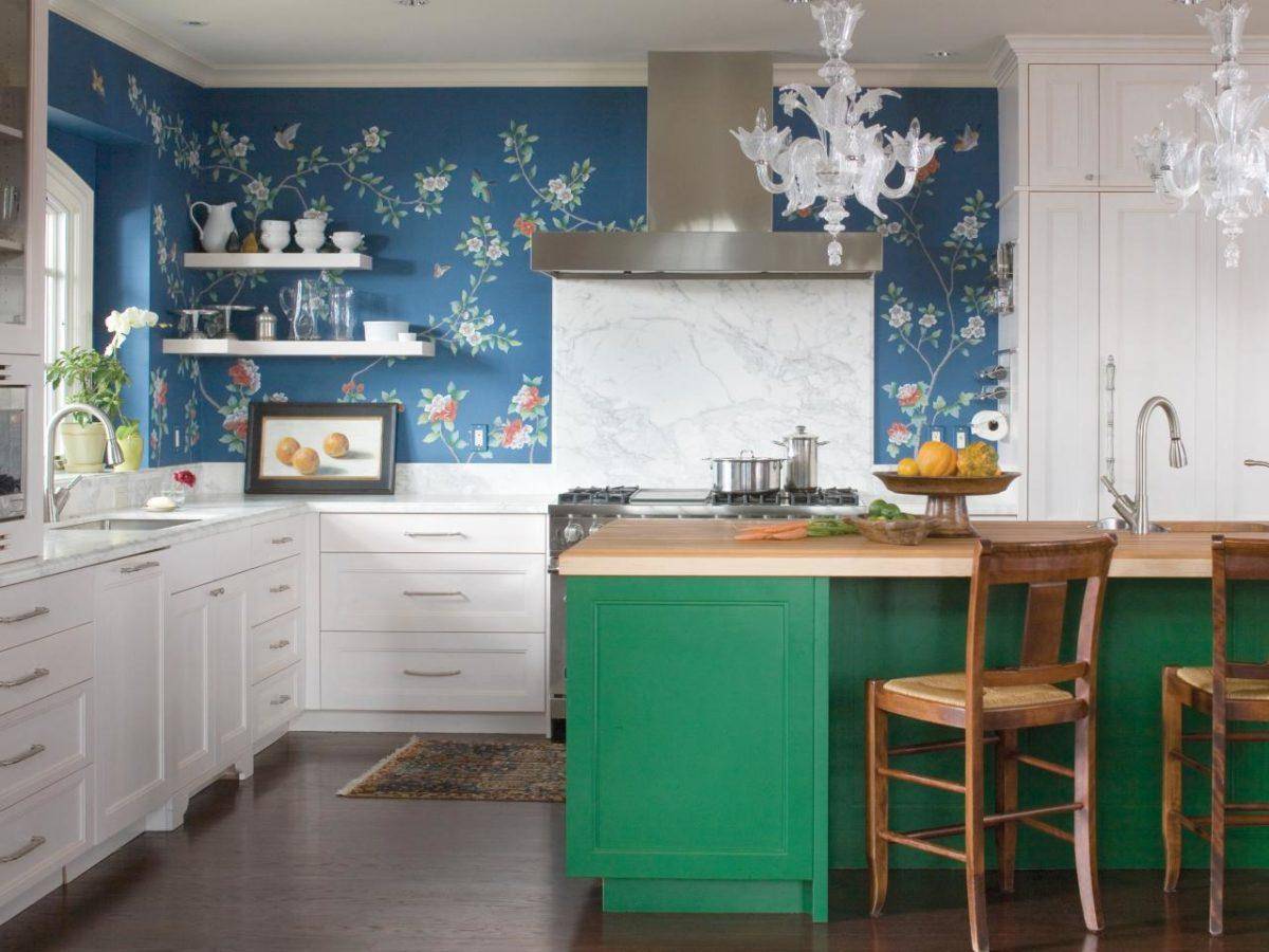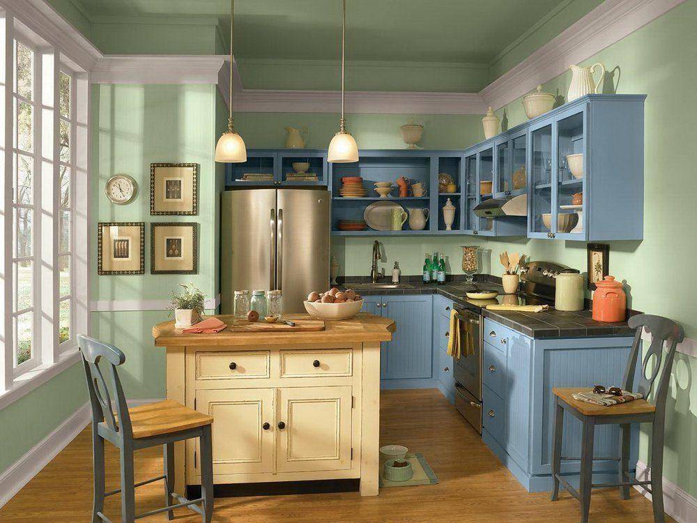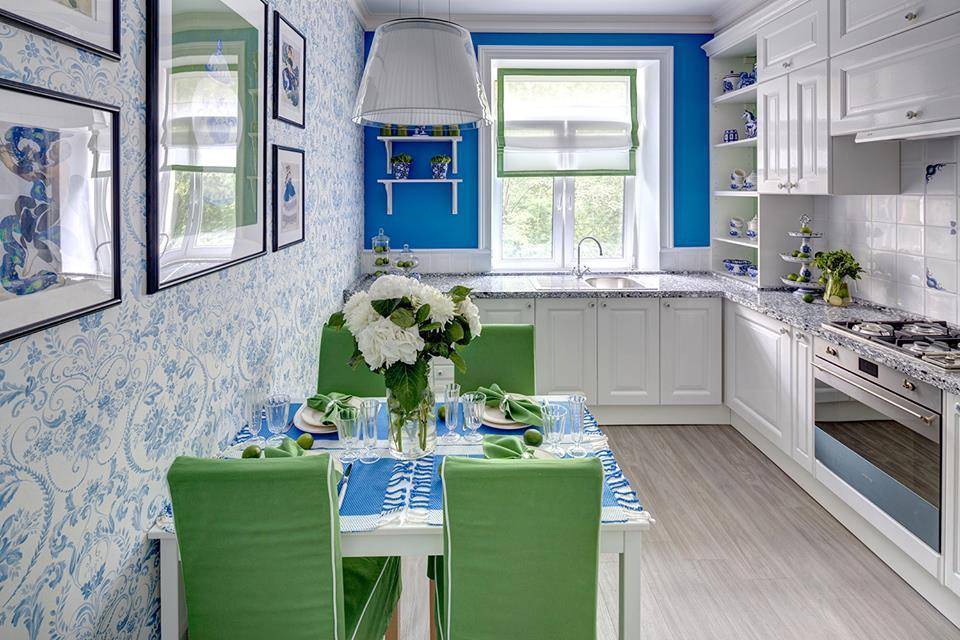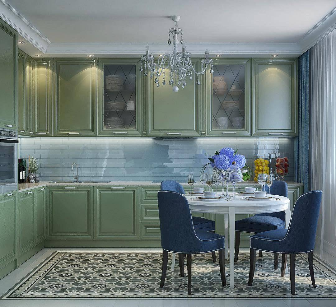 Зеленые краски на фоне синей кухни нужно вводить очень искусно, лучше всего, чтобы это были оливковые, болотные или бирюзовые цвета. При удачном сочетании эти природные оттенки способны оживить и освежить вашу кухню.