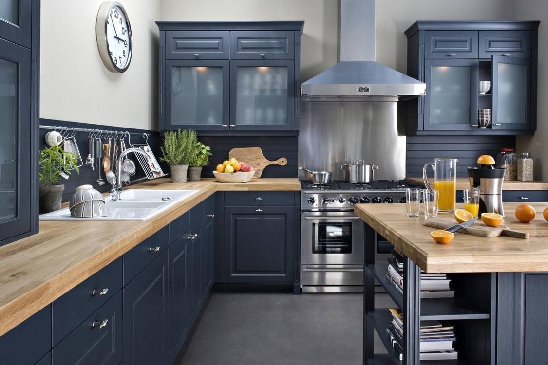 натуральное дерево добавляет в интерьер синей кухни теплые нотки