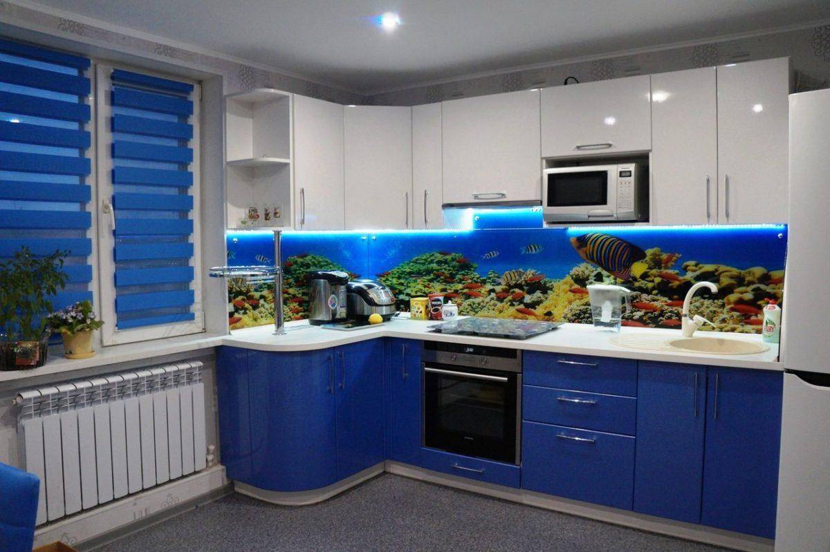 На фото яркая вставка на фартуке разбавляет синий цвет гарнитура.