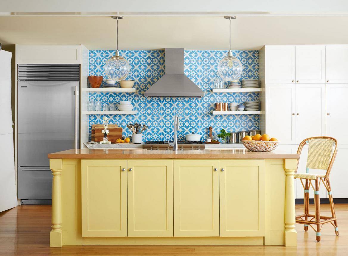 Эта жизнерадостная палитра станет великолепным дополнением основного дизайна кухни, выполненного в синих тонах. Очень органично в нежно-голубом интерьере смотрятся желтые корпуса навесных шкафчиков с прозрачными дверцами.