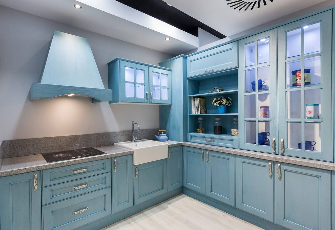 - Голубой цвет благотворно влияет на психику человека. Он способствует расслаблению, дарит чувство покоя и умиротворения. Достаточно вспомнить эмоции, которые вызывает у нас голубое небо или гладь моря. Оформленная в таком цвете кухня может вызывать примерно те же ощущения.