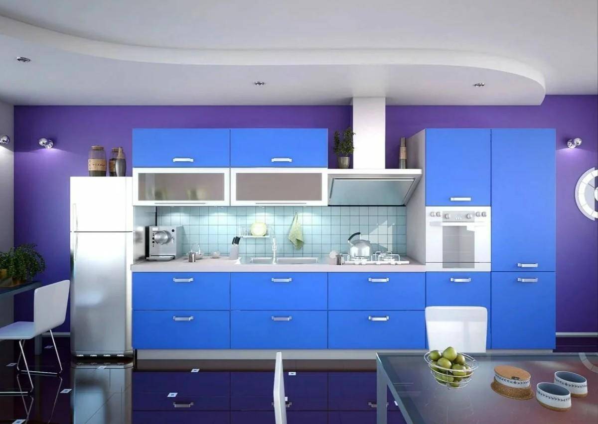 Синюю кухню не стоит сочетать ни с какими цветными стенами. Максимум – это еле-заметный серо-голубой тон стены. А лучше – просто белый.