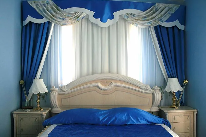 Для спальни следует выбирать обои светло-синего цвета, ближе к голубому, поэтому шторы рекомендуется выбрать более нежных оттенков. Возможен бархат, но не темно-синий, а голубой, белый или даже серый. Очень красиво смотрятся в спальне гардины, подвязанные синими лентами. Шторы из парчи кажутся менее праздничными, чем бархат, и вполне могут подойти для спальни.