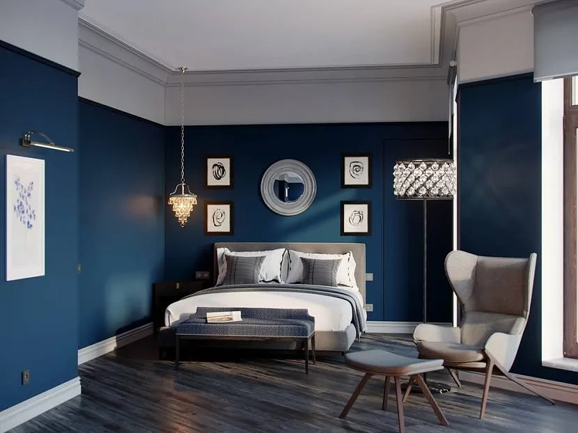 Чтобы спальня в синем цвете не превратилась в холодное и скучное помещение, важно разбавлять основной тон другими оттенками