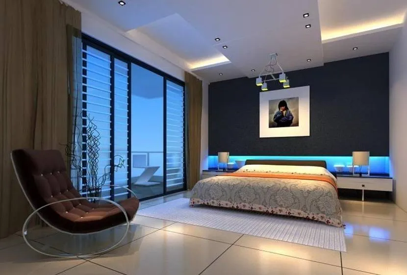 Комната для сна в стиле хай-тек – полная противоположность предыдущему подходу. Высокотехнологичные приборы, металлические элементы и стекло позволяют поддержать это направление, а синий оттенок достигается за счет обилия встроенной подсветки.