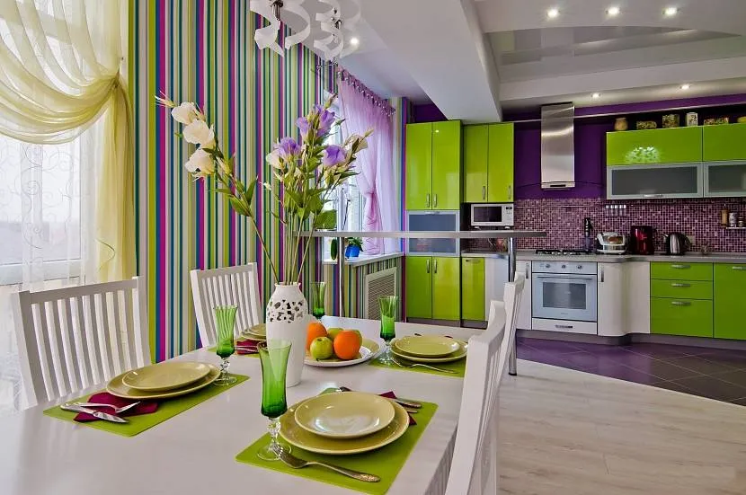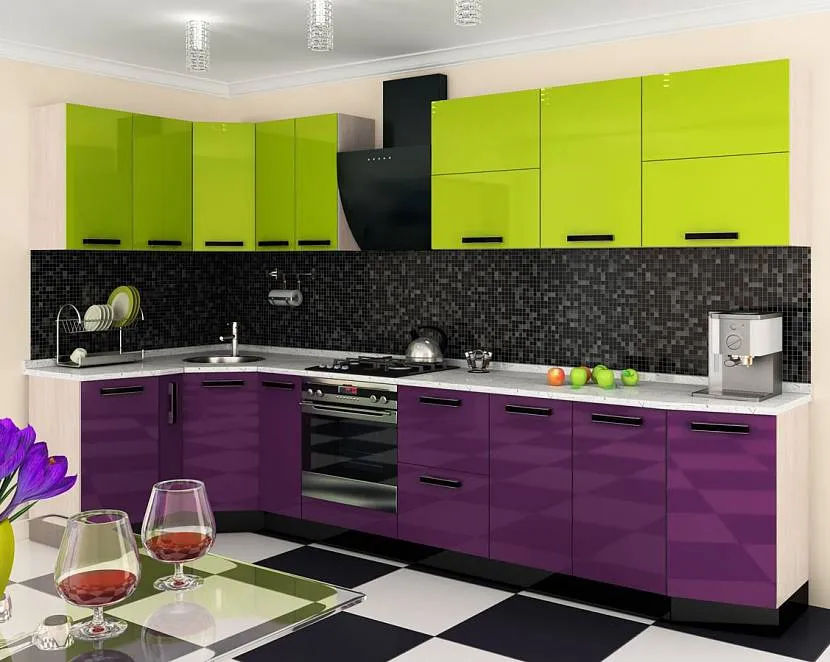 Сочетание салатового и фиолетового цвета в интерьере кухни получается приятным и веселым.