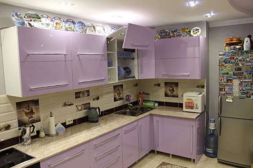 Кухня нежного фиолетового оттенка сочетается с кухонным фартуком бежевого цвета. Выглядит такой интерьер ярко и современно.