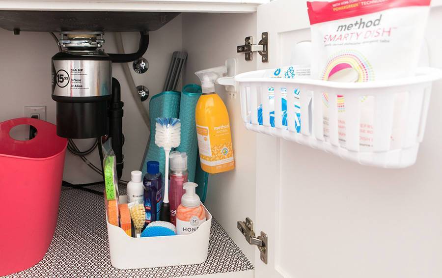 - Отличным местом для хранения чистящих средств, губок для уборки и тряпок станет шкафчик под раковиной. Губки для посуды также можно хранить в органайзере, который крепится на мойку. Это поможет защитить раковину от стекающих капель и брызг.