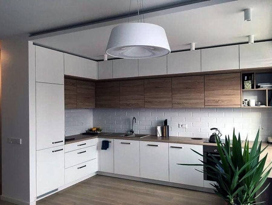 Не стоит оставлять место над верхними шкафами, и вместо этого лучше проектировать трехъярусный вариант под самый потолок.