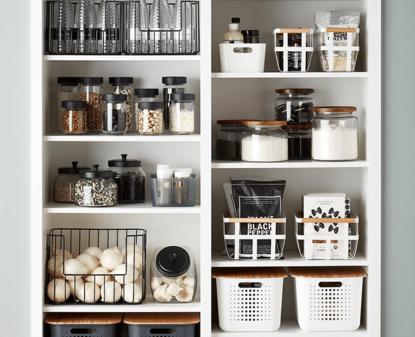 Верхнюю часть мебели стоит отвести под часто используемые вещи, а нижнюю лучше оборудовать выдвижными ящиками. Здесь могут храниться редко используемые предметы. Обязательно выделите место для хранения овощных запасов. Для этой цели можно использовать специальные лотки или плетеные корзины. Чтобы мгновенно находить нужное, украсьте контейнеры и ящички надписями.