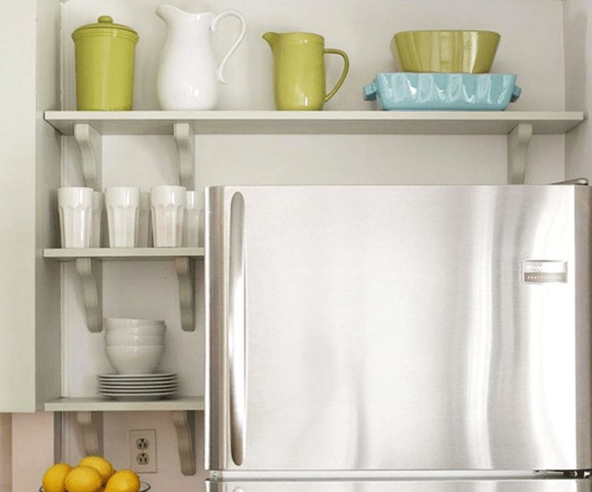 Практически у каждой хозяйки есть на кухне предметы, которые она использует нечасто. Им можно найти место на полках поверх шкафов. Зона до потолка зачастую оказывается пустой. Она прекрасно подойдёт для размещения дополнительных полочек.