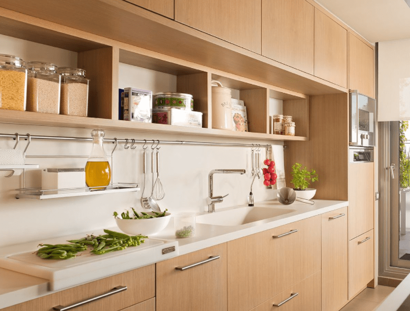 Если квадратура маленькая, то систему хранения вещей на кухне нужно продумать так, чтобы получилось использовать стены. Существуют открытые полки, подвесные шкафы, на которых легко разместить посуду, специи и т.д.