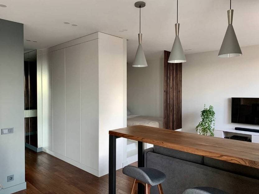 Этот элемент может также выполнять роль разделителя двух комнат. Это возможно, благодаря конструкции с использованием несущих элементов, смонтированных на потолке.