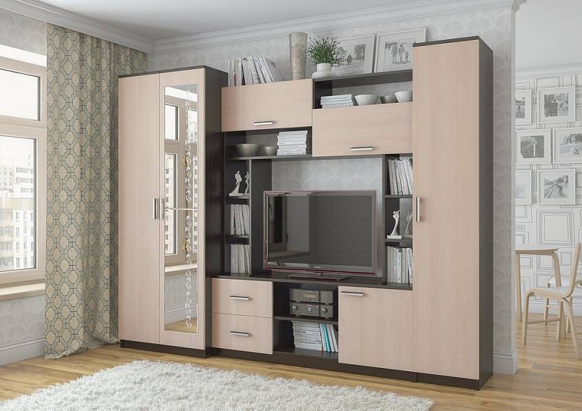 Сегодня производители делают стенки из древесно-стружечной плиты с таким качеством, которое не уступит аналогам в исполнении дерева.