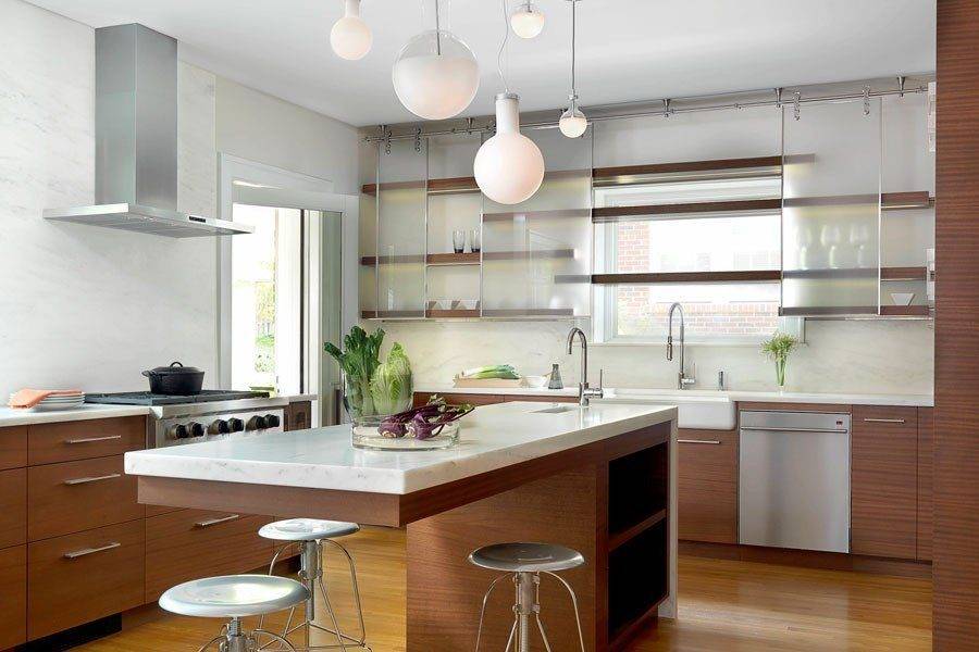 Для малогабаритной кухни распашные дверцы в кухонных шкафчиках могут стать проблемой – если забыть их закрыть, то можно неприятно удариться головой. От них можно отказаться в пользу раздвижных – они более оригинальные и функциональные
