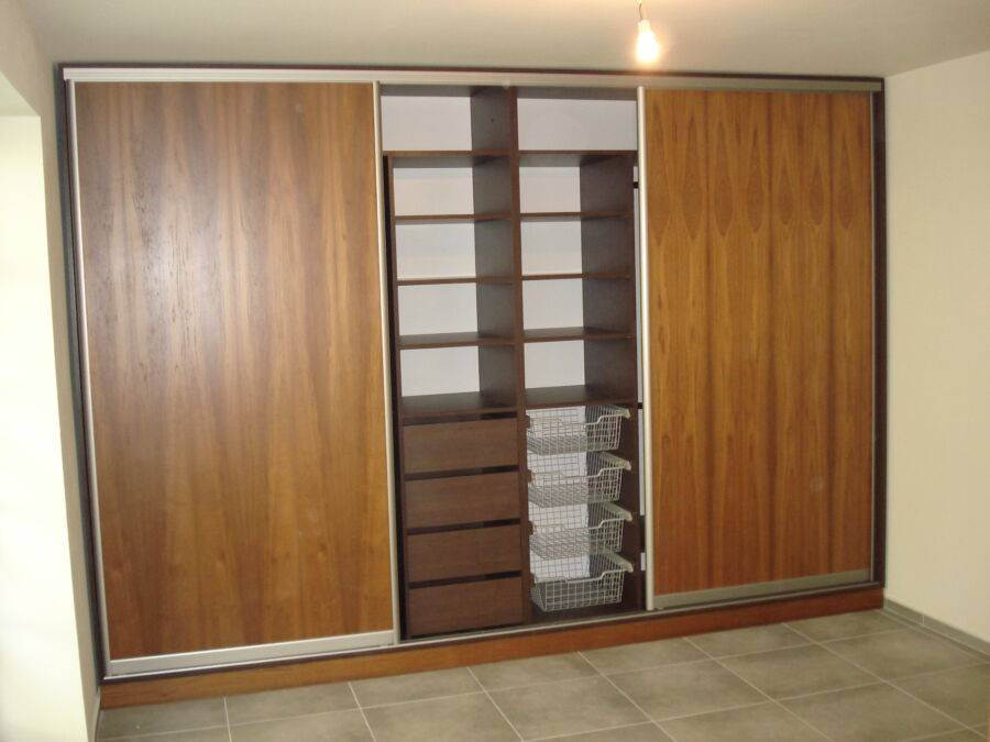 Два ряда полок можно разместить отдельно вдоль боковых стенок или вместе в средней секции. В трехдверном шкафу не ставьте ящики напротив того места, где двери сталкиваются.