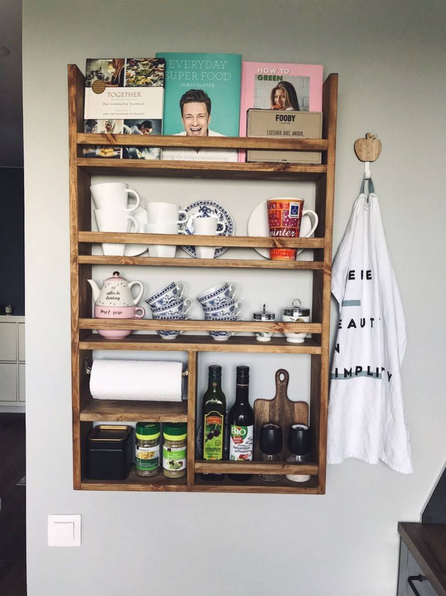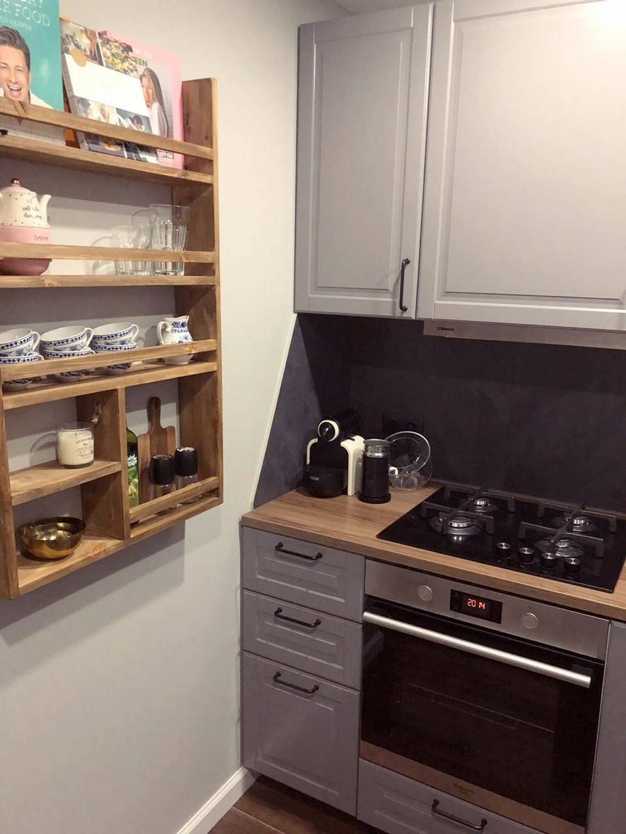 Открытую полку делали под заказ — я ее обожаю. Ни разу не пожалела, что ее сделала, и планирую следующую кухню только с полками вообще без верхних шкафов. Пыль на ней не копится, поскольку практически все вещи с неё мы используем каждый день. Да и учитывая размеры кухни, убираюсь я все равно по времени меньше, чем счастливые обладатели кухонь от 10 метров, даже если у них убрано за дверцы все-все-все.