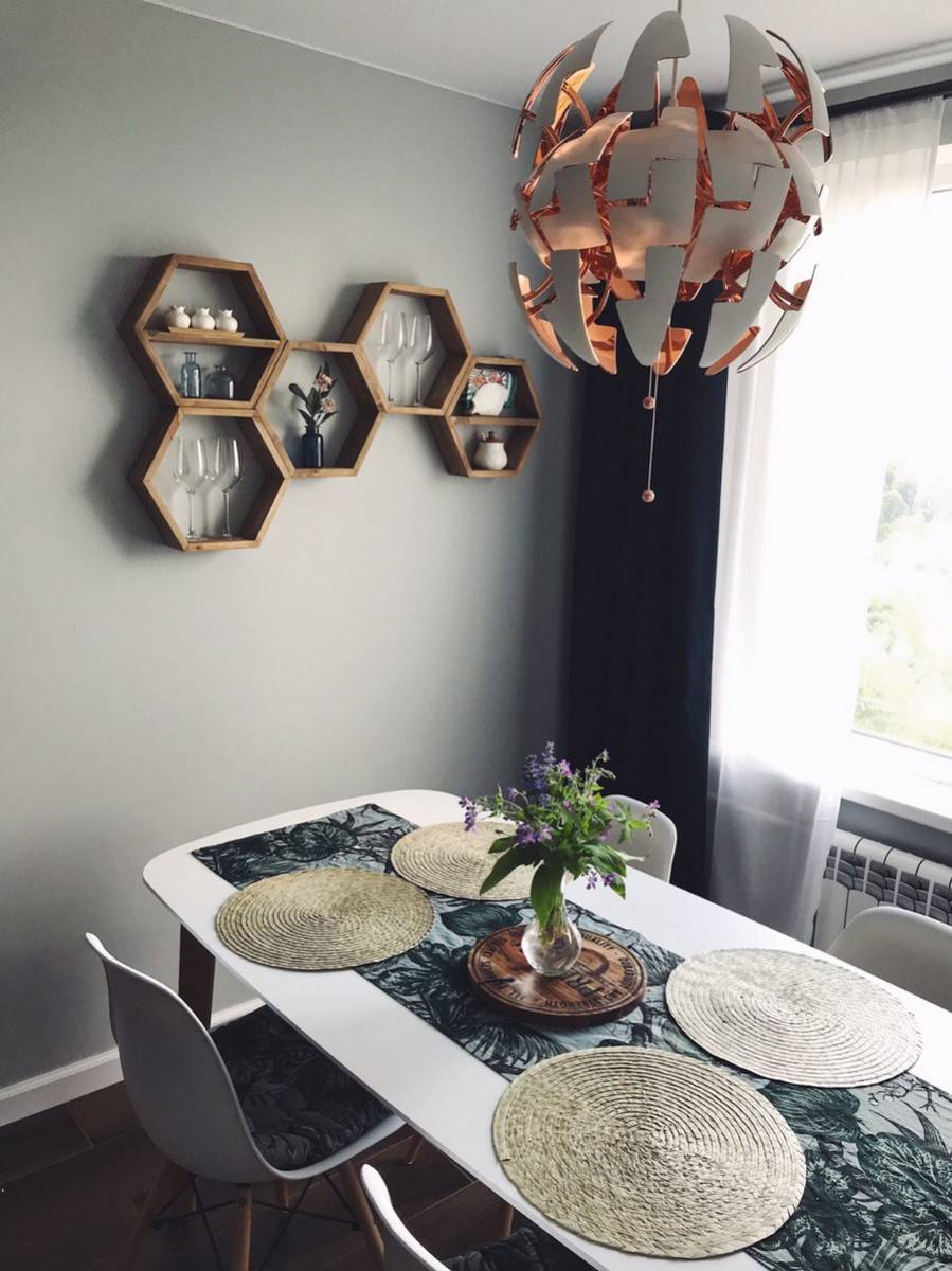 Обеденная группа на кухню не поместилась. Нас четверо, любим завтракать и ужинать все вместе, и того стола, который помещался в нашу кухню, нам не хватало. Зато есть гостиная с местом для столовой зоны, куда мы поставили большой стол 160х80. Место для откидного столика на кухне оставили, но за полгода так на него и не созрели.