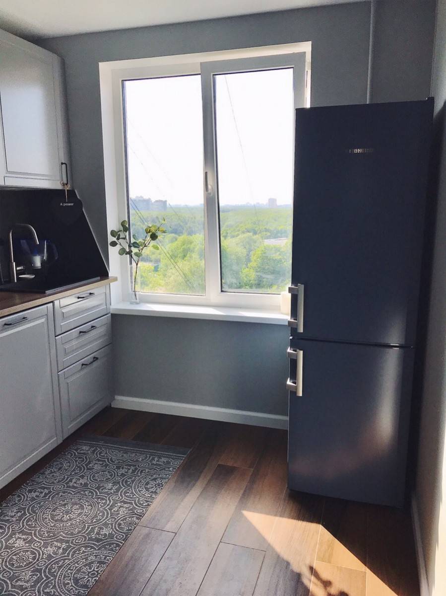 В углу расположился холодильник Liebherr из бюджетной линейки. На полу керамогранит Italon Maison Walnut 120х20. На стене краска Dulux 30GY 56/023.