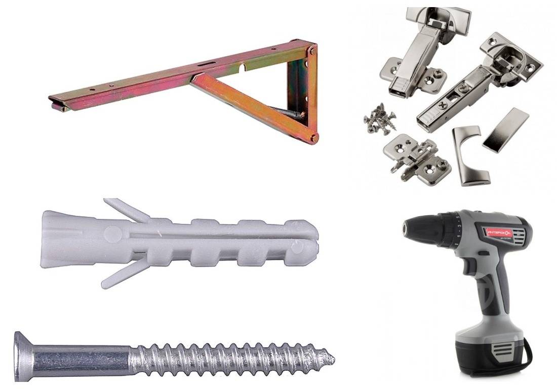 Для навесных моделей можно использовать фиксированные опоры или вариации в виде болтов, петель, уголков. Петли чаще всего используются для откидных столешниц. Иногда в комплектацию могут входить защелки и откаты, а также инструкция по сборке.