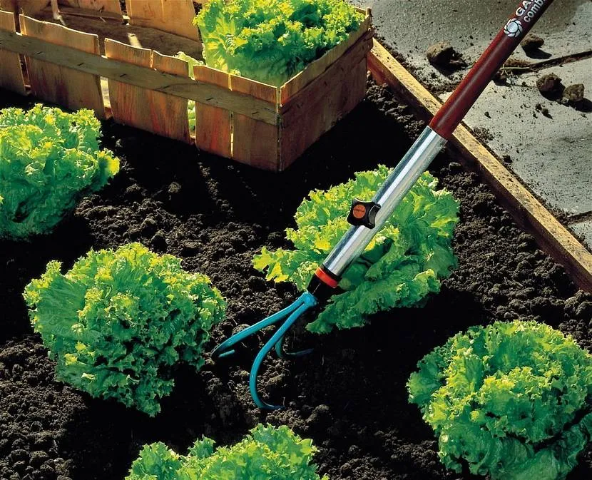 Взрыхление почвы на грядках с кучерявым салатом культиватором ГарденаИсточник snail.ru